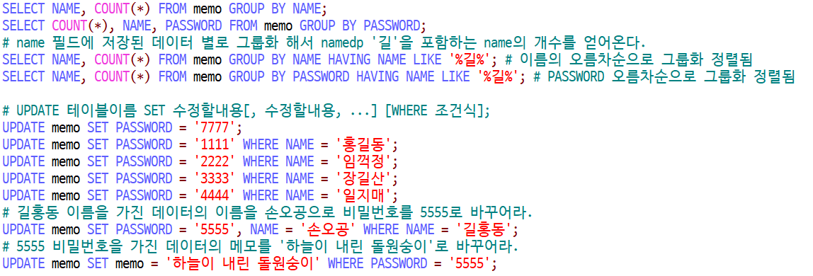 # SELECT NAME, COUNT(*) FROM memo; # 에러