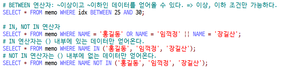 # IN 연산자는 () 내부에 있는 데이터만 얻어온다.
