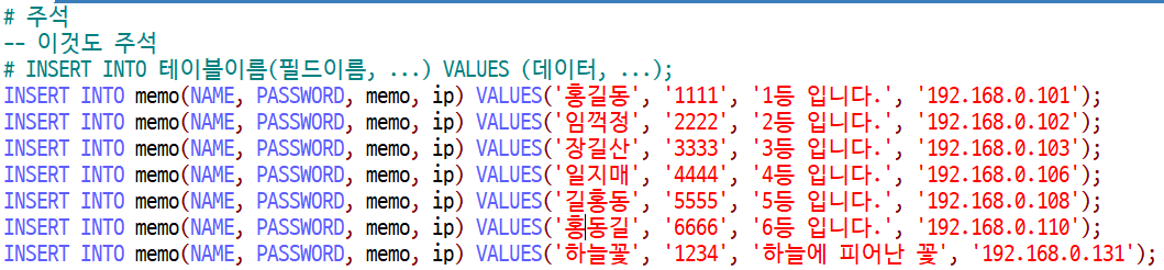 INSERT INTO memo(NAME, PASSWORD, memo, ip) VALUES('임꺽정', '2222', '2등 입니다.', '192.168.0.102');