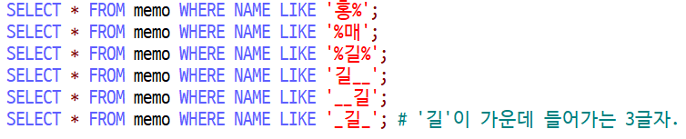 SELECT * FROM memo WHERE NAME LIKE '_길_'; # '길'이 가운데 들어가는 3글자.