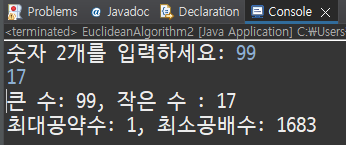 System.out.printf("최대공약수: %d, 최소공배수: %d\n", high, l);