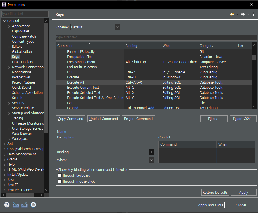 Eclipse의 모든 단축키는 Window >> Preferences >> General >> Keys 메뉴에서 확인 및 변경이 가능하다. 그 동안 다른 툴에서 자신의 손에 익숙한 단축키들이 있다면 이 메뉴에서 단축키들을 변경하는 것이 가능하다.